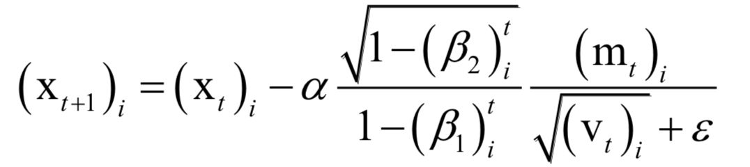 其中β1,β2是人工指定的参数,i为向量的分量下标。依靠这两个值构造参数的更新值,参数的更新公式为: