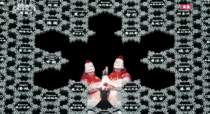 随着中国代表队入场之后,引导牌随着志愿者的动作汇聚在一起。此时,巨大的虚拟雪花开始形成。