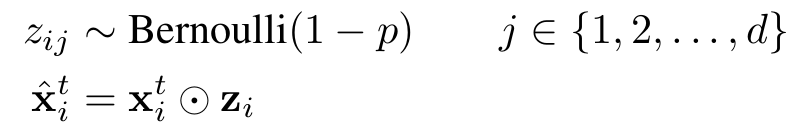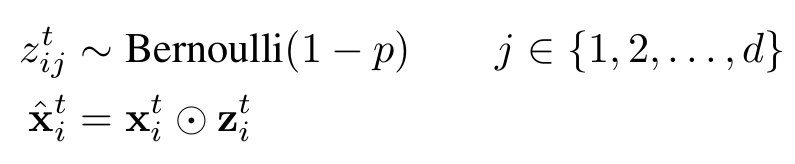dropout是Hinton提出来的一种防止深度神经网络出现过拟合的技巧,它的做法是在训练神经网络的时候随机地让某些神经元的输入变为0,公式如下所示,通过生成一个概率为1-p的伯努利分布再与神经元的输入进行点乘,即可得到dropout以后的输入;而在推理阶段,我们只需要对输入乘以伯努利分布的期望值1-p即可。dropout对于前向神经网络作用很明显,但是应用到循环神经网络中的时候,很难取得较好的效果。