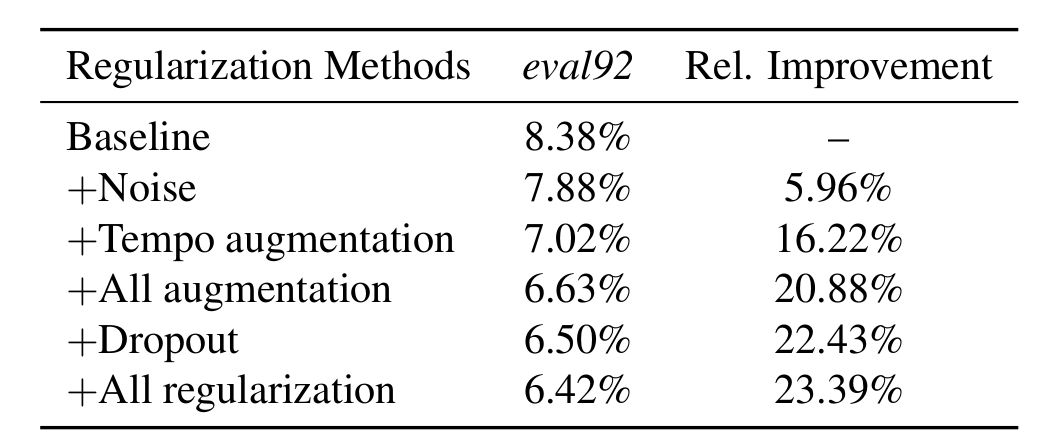 数据增强部分,作者基于tempo的增强参数是取自(0.7, 1.3)的均匀分布,基于pitch的增强参数是取自(-500, 500)的均匀分布,添加高斯白噪声的时候将信噪比控制在10-15分贝,同时在调整速度方面,作者分别使用了0.9,1.0和1.1作为调整的系数。综合上面所有数据增强技巧,如下图所示,模型的性能相比没有这些技巧的baseline提高了20%。