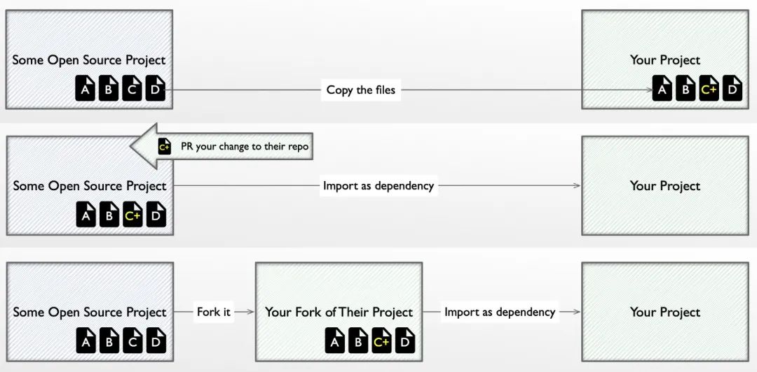 有三种不同的方式可以让你在你的项目中修改他人的代码。最上面的一种做法是不好的。