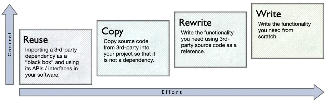 重用:根据你的环境,你可能会在 lib 中建立链接,或者在 pom.xml 或 package.json 中添加一个条目。不管你怎么做,“重用”就是抓取别人的代码,通过它的接口来使用,而不去关心它的内部结构。这段代码还可能会“偷渡”到一群横向的依赖关系中去,这会给你带来麻烦。最少的努力,带来的是最少的控制。