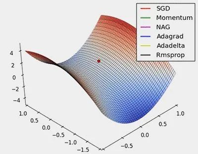 从上面的动画可以看出,自适应算法能很快收敛,并快速找到参数更新中正确的目标方向;而标准的SGD、NAG和动量项等方法收敛缓慢,且很难找到正确的方向。