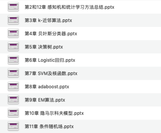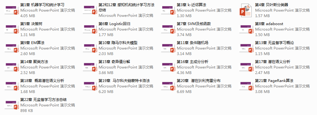 课件总共 22 章,与书籍目录分别对应,前 12 章为监督学习部分,对比第 1 版在监督学习方法上进行了一些修改,但出入不大。