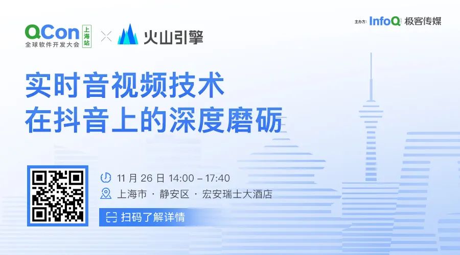 一定!一定!不要错过 QCon 全球软件开发大会【实时音视频技术在抖音上的深度磨砺】专场,名额有限,先到先得,扫描下方二维码或点击阅读原文报名~