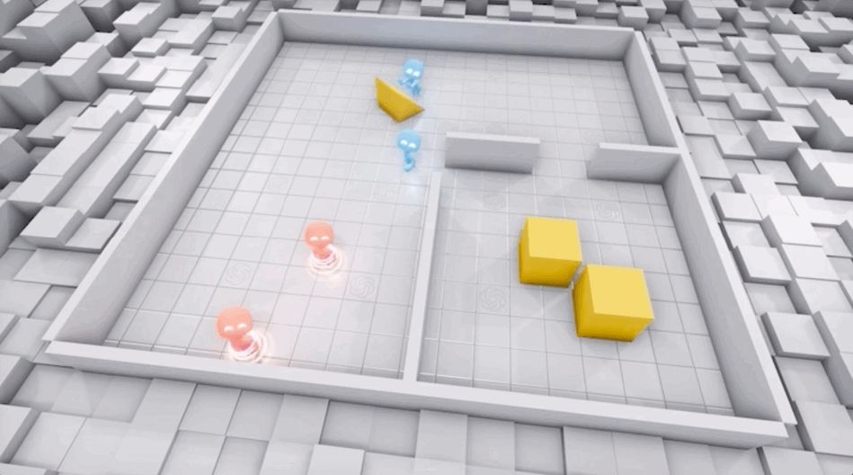 环境中不仅散布着隐藏方和搜索方可以适时抓取和锁定的目标,而且还有智能体必须学习操控的随机生成的固定房间和墙壁。