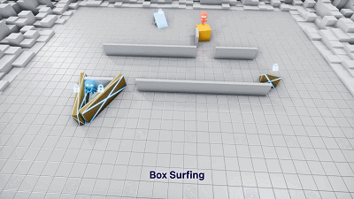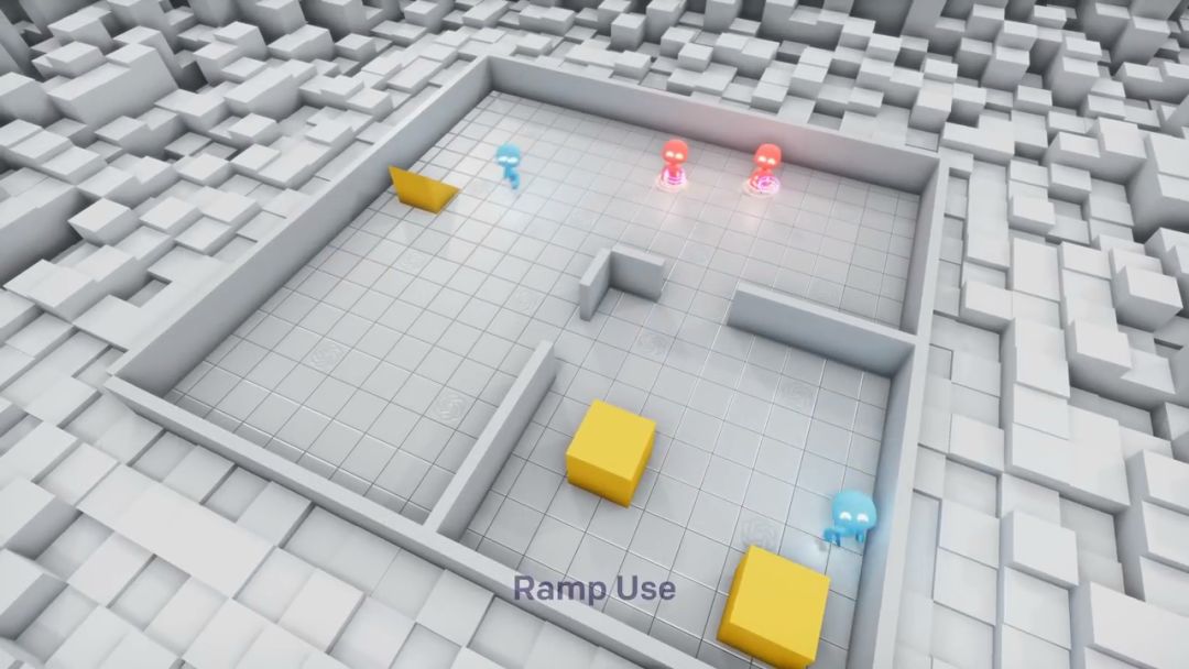• 借助盒子滑行:由于智能体可以通过自己施力来移动,他们可以抓住一个盒子并站在盒子上滑行至隐藏者的位置;