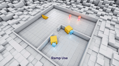 为了进行这个捉迷藏游戏,OpenAI 首先构建了一个包含墙、盒子和斜坡的 3D 环境。在这个环境中,智能体以团队为单位进行捉迷藏游戏。