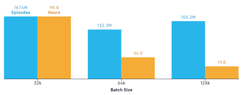 增加 batch 大小加速收敛。注意:作者给出的是在反向传播中使用转换连续块的数量的 batch 大小,每个包含 10 个转换,也就是图中 64k batch 实际上包含 640k 个转换。