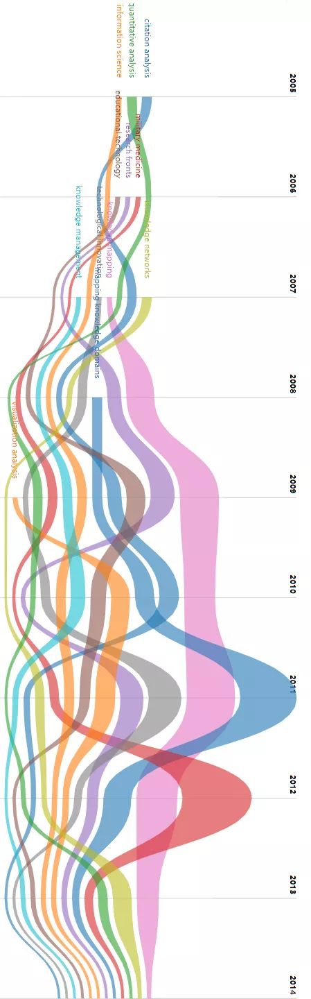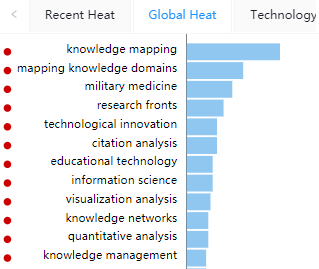 就全局而言,知识图谱的热点主要集中在knowledg mapping、mapping knowledge domains、military medicine、research fronts、technological innovation等领域。