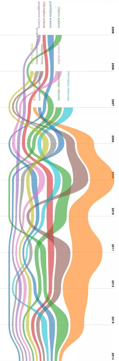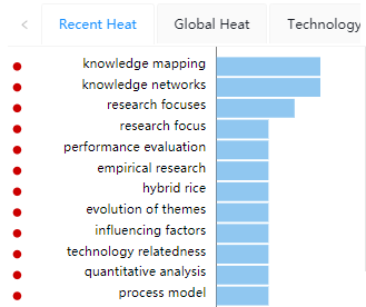 近期知识谱图的研究热点主要在knowledge mapping、knowledge networks、research focuses、performance evaluation等领域。