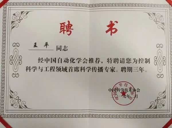 为配合中国科协开展相关工作,经我会推荐,中国自动化学会在科学传播领域有深入成果的刘富、王平、段海滨等3位同志被中国科协聘任为全国首席科学传播专家(第六批),聘期3年。