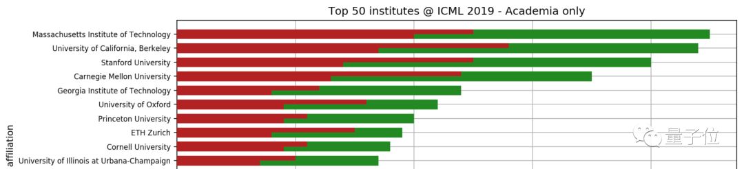 学校方面的排名前五的是:麻省理工学院47篇、加州大学伯克利分校45篇、斯坦福大学40篇、卡内基梅隆大学35篇、佐治亚理工学院24篇。