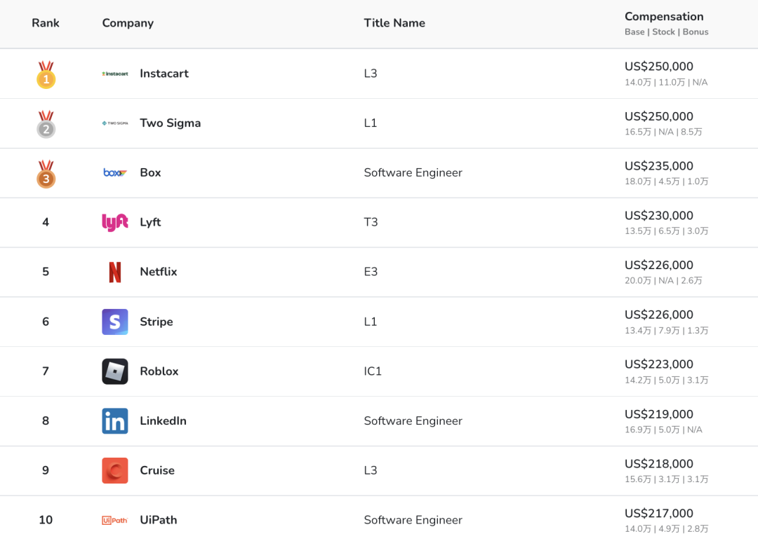 排名前十的公司中,可以看出为这些经验较少的程序员开出年薪中位数均都超过了20万美元(约137万元),其中就包括Roblox、Linkedin、网飞等有名企业。提供零售配货服务的Instacart以25万美元居首。