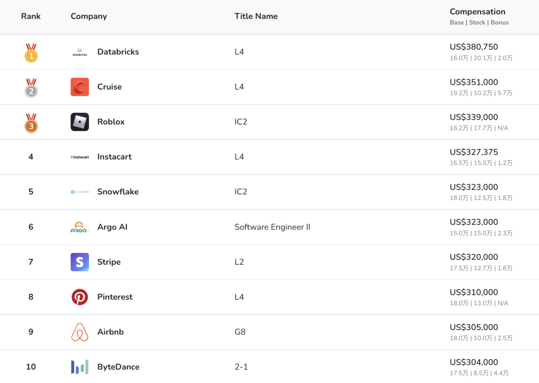 美国企业软件公司Databricks为高级工程师开出的年薪中位数为54.9万美元,位列第一。字节跳动以44.3万美元(约303万元)名列第6,对应工程师级别为2-2。