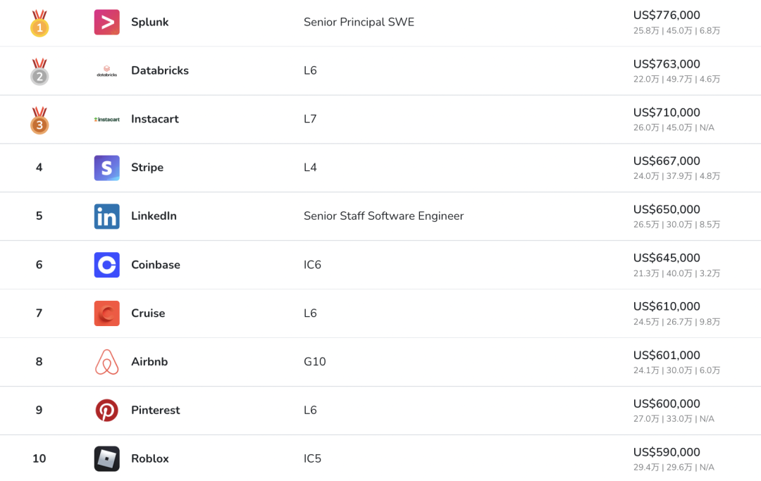 数据显示,字节跳动高级工程师年薪44.3万美元(303万元)位列第6,Roblox为首席工程师开出了120万美元(823万元)的天价。