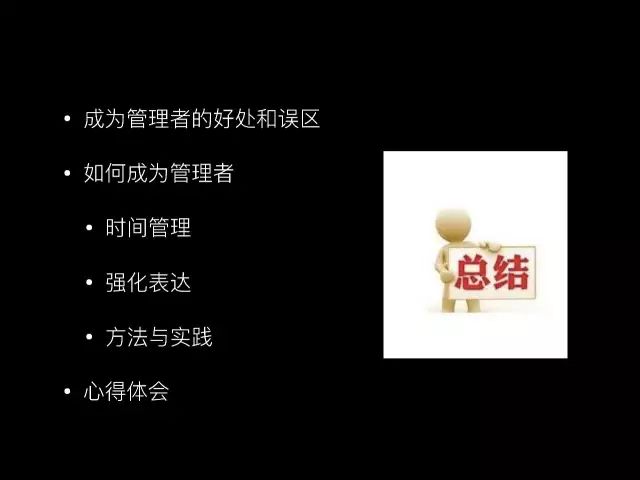 最后我大概总结一下,开始的时候讲了成为管理者的一些好处和误区。我分享了成为管理者的三个非常基础的方法,一个是时间管理,一个是强化表达,最后一个是看一些方法论的书。