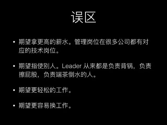 讲完成为管理者的原因,我觉得还有一些误区大家需要特别关注。我见到一些技术人他们想做管理者,但是当问这些技术人他们为什么要成为管理者时,我觉得他们的理由是不对的,这里我列给大家。