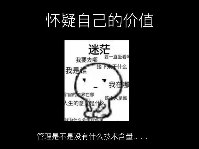 第二个坑就是迷茫,我是谁?我要做什么?管理很多时候给大家带来的价值,或者给团队带来的价值会有点虚。