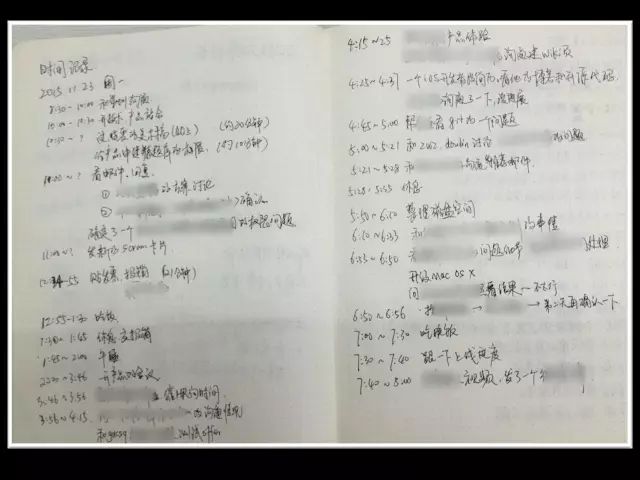 这个就是我 2015 年底某一天写的时间花费清单,那段时间我经常觉得自己时间很乱,然后我就专门花时间记下来,然后去分析自己的时间花费,做着做着我就发现,确实在时间管理上要好很多了。