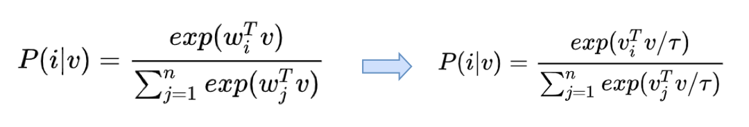 如果是一个多分类场景,上面这个任务是可以用典型的 softmax loss 来解决。但是在 instance discrimination 中,这个多分类的类别数可以是所有样本的个数,此时如果还要训练出所有去那种 w,显然是不现实的。