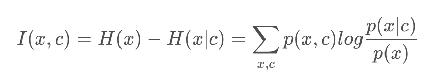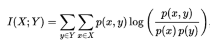 首先介绍互信息。两个变量的互信息是变量间相互依赖性的量度,互信息用来度量两个事件集合之间的相关性。它度量 X 和 Y 共享的信息,比如知道其中一个变量后,对另一个变量不确定度减少的程度。当 X 和 Y 相互独立,则 X 的存在对 Y 不提供任何信息,此时互信息为 0。X 和 Y 的互信息数学定义如下,我们只考虑离散变量(连续变量时,就是积分形式):