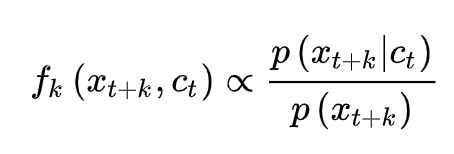我们的目的当然是最大化当前检索文本 c 和正例 x 之间的互信息。那么 infoNCE loss 是不是能保证我们的目标呢?我们先把上面的 infoNCE loss 写成下面的形式