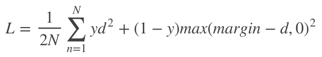 其中 d 代表当前 pair 的距离,当y=1,即是正样本对时,我们希望正样本 pair 间距离越小越好最好等于0,所以此时 loss 剩下的 是我们需要优化。当 y=0,即使负样本对时,我们希望二者距离越大越好。大到什么程度呢?这就需要设置一个 margin,当负样本对距离比设置的 margin 小,我们认为模型训练的还不够,需要继续减小这部分 loss 的大小,所以此刻 loss 剩下的是 。当负样本距离已经比 margin 大了,我们认为模型已经可以了,所以 loss=0 无需调整。