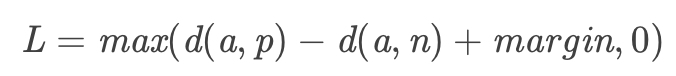 上式中,d(a,p) 、d(a,n) 分别表示 anchor 样本与 positive 、negative 样本之间的距离。当 d(a,p) > d(a,n)时,说明 anchor 离正例的距离比到负例的距离还远,此时 loss > 0 需要优化。当 d(a,p) < d(a,n)时,符合 loss 设计的思想,但是这个力度还不够,因此需要再设定一个 margin。让 d(a,p)+margin < d(a,n)时,说明 anchor 与 positive 之间的距离很小,加上一个 margin 后还小于anchor 与 negative 之间的距离,这是我们追求的理想状态,此时 loss=0 无需优化。