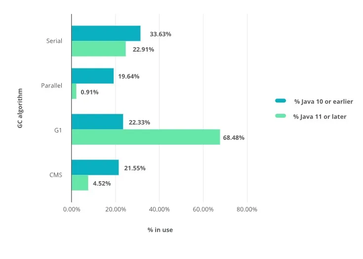 容器非常流行,有 70% 的应用程序是在容器中运行的。报告显示,60% 在容器中运行的应用程序使用两个或更少的核心。这是有意义的,因为容器通常与微服务架构相关,但这也可能是不利的,因为默认的 G1 垃圾回收器在两个或更多核心下才能发挥得最好。
