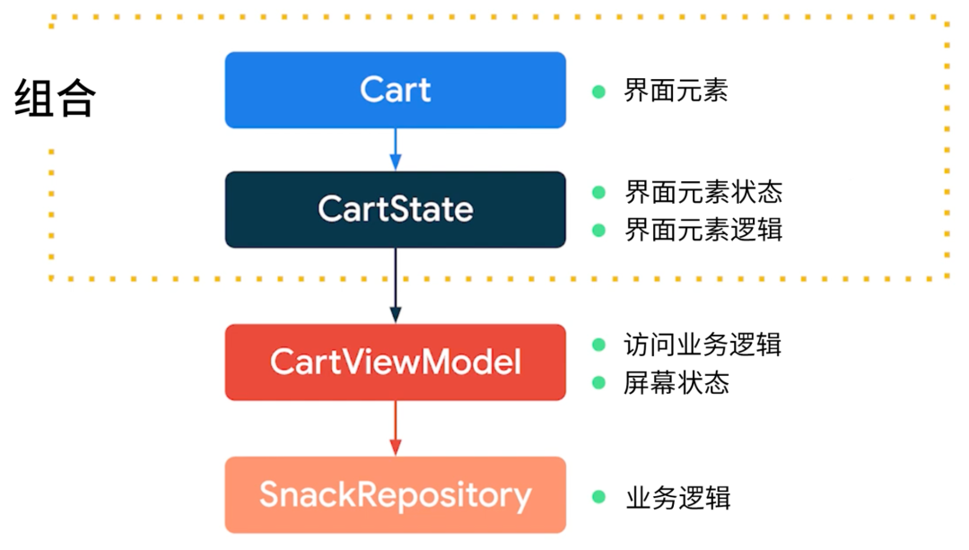 Cart 中同时使用了 ViewModel 和其他状态容器,它们具有不同的用途,并可以协同工作。我们来仔细看一下它们的生命周期: CartState 会遵循 Cart 可组合项的生命周期,当 Cart 从组合中移除后 CartState 也会一同移除;而 CartViewModel 具有不同的生命周期,即导航目的地、导航图、Fragment 或 Activity 的生命周期: