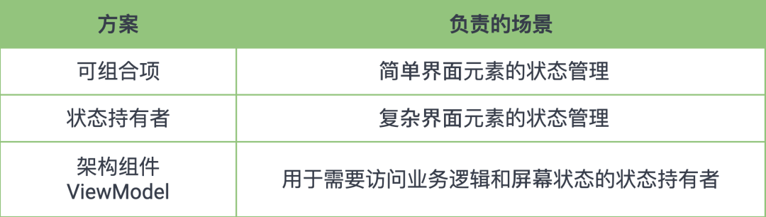 使用遵循可组合项界面生命周期的状态容器 (即使用一般的类作为状态容器),将会难以做到前述操作。尽管如此,如果 ViewModel 的优势不适用于您的用例或者您以不同的方式操作,您可以使用其他最适合您的状态容器,而不一定是 ViewModel 来完成相应的工作。