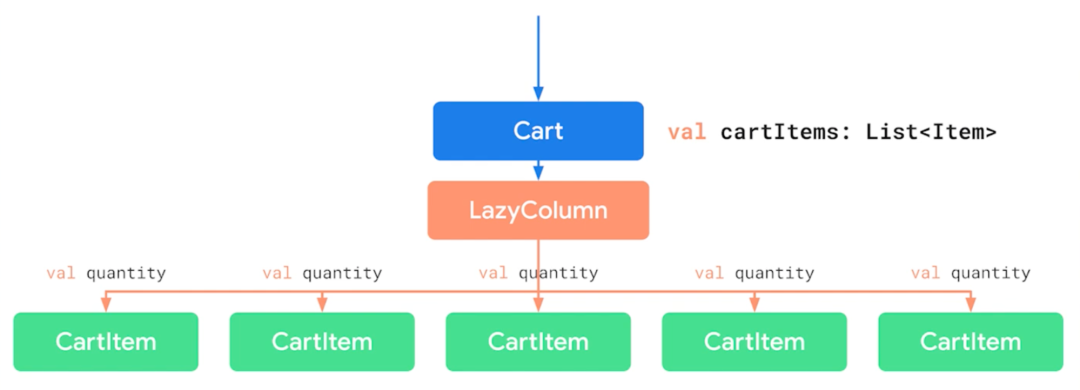 fun CartItem(quantity: Int, // 状态incrementQuantity: () -> Unit, // 事件decrementQuantity: () -> Unit // 事件) {Row {Button(onClick = incrementQuantity) {Text("+")}Text(quantity.toString())Button(onClick = decrementQuantity) {Text("-")}}}