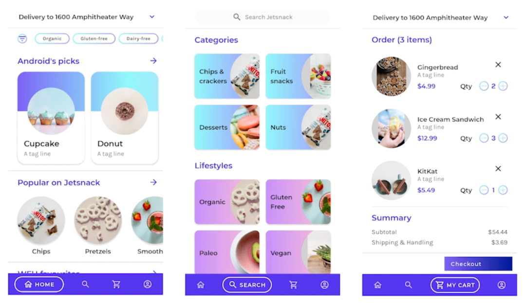 现在,我们在 JetsnackApp 中获取了 appState 的新实例。我们使用该实例将被提升的状态传递给可组合项,并在需要显示界面元素时检查该状态;同时调用函数来触发与界面相关的操作: