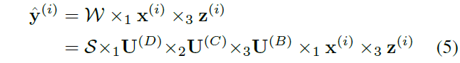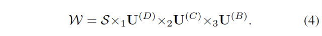 公式3里的W是一个三阶张量,有着非常复杂的计算难度。所以我们首先对W使用Tucker分解,将W分解为如下形式: