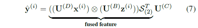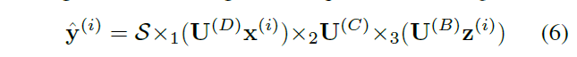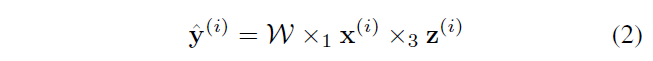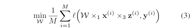 在这里,W是一个融合模型,一个D*C*B的三阶张量,x是D维特征向量,z是B维特征向量。y是最后标签,是一个C维向量,表示目标被分成C类。注意,公式2里的的乘法均为张量点积(tensor dot product)。所以,如果要对M个样本进行建模,求得一个最终的分量W的话,最终的目标函数即为: