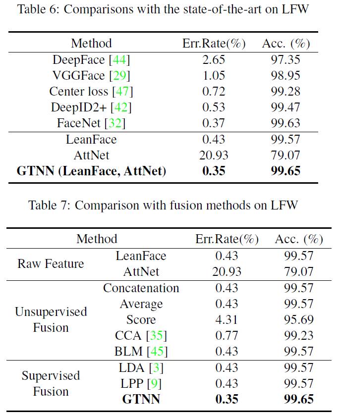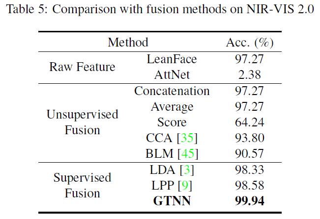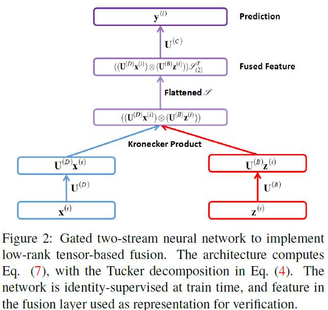 本文作者提出了一种基于张量的图像特征融合方法。证明这种张量融合方法和神经网络等价之后,作者直接使用神经网络来学习并得到最终融合后的特征。最后的实验证明,融合后的特征在MultiPIE,CASIA NIR-VIS2.0和 LFW 数据集上都取得了不错的效果。