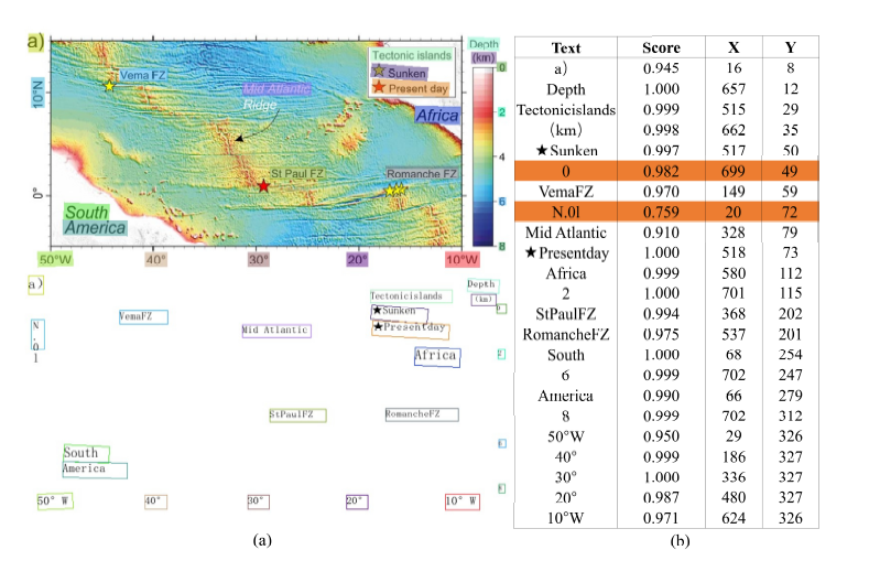 地理位置的数据主要来自于配图和论文中提及的文本。对于地理插图,我们首先通过pdffigures2进行图片抽取,随后使用PaddleOCR进行文本识别,再通过geocoder生成坐标并从插图中的数字提取经纬度范围。OCR识别的一个例子如图1所示。对于地理/社会/政治实体,我们构建了基于BERT的命名实体识别模型,并通过geocoder得到坐标。
