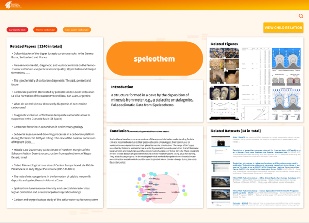 一个学术的探索,要对领域的知识体系有全面的认识,并且也要清楚了解知识体系中的各类知识点涉及的论文、年代和地理位置信息。GAKG-Navi提供了由地学专家人工挑选的地学全知识体系的可视化,同时每个知识点关联了相关的论文、图片、表格、百科知识和数据集,并对相关的文章给出机器生成的总结摘要。用户可以在此独特的系统中进行知识点的遨游和穿梭。
