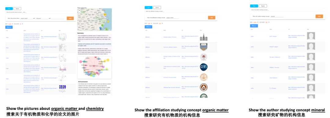 一个创新的研究,要对学科领域的论文进行充分的调研,地学也是如此。我们对此给出多模态的地学语义搜索系统。区别于谷歌学术等学术搜索引擎,GAKG-Search基于GAKG的地学文章知识点和提及的关键要素进行语义层面的相关性匹配,并返回论文及论文涉及的图片、表格、时代以及地理位置信息,弥补了关键词匹配式搜索忽略了语义信息的缺点。
