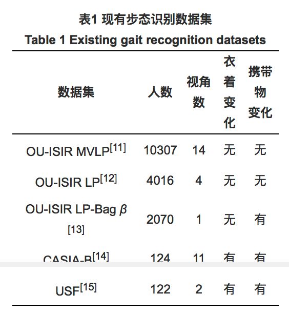 步态数据集在收集同一个人在不同状态下的行走视频序列时, 需要测试者在协作的情况下进行, 这导致采集的困难.而验证步态算法和模型的有效性依赖于合适的步态数据集, 并且数据集中包含的对象数量对于深度学习而言也尤为关键.目前, 常用于验证基于深度学习的步态识别方法有效性的数据集包括:日本大阪大学的ISIR数据集(包括MVLP[11], LP[12]及LP-Bag β [13]3个常用子数据集)、中国科学院的CASIA-B数据集[14]、美国南佛罗里达大学的USF数据集[15].表1总结常用的步态数据集.