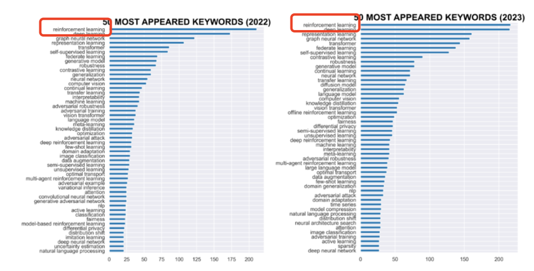2022 年和 2023 年 ICLR 论文投稿关键词频率比较(引自AI科技评论)