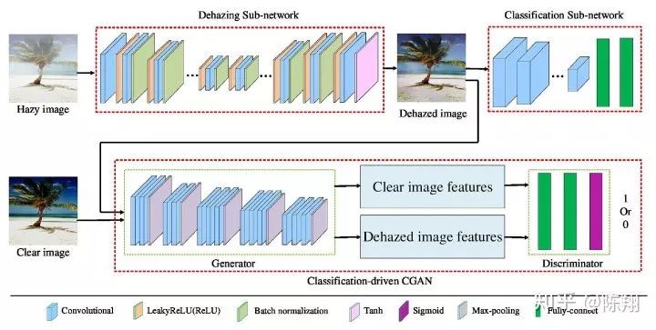 为此,作者提出了一个统一的CNN架构,其中包括三个部分:除雾子网(DNet),分类驱动的条件生成对抗网络子网(CCGAN)和与图像分类有关的分类子网(CNet),它们在视觉吸引力和图像分类方面都有较好的表现。