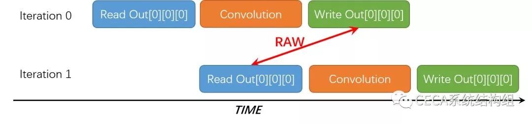 通过分析代码和 HLS 工具的 Warning 我们可以发现,问题出在 Out 这个数组上。在我们的实现中,Out 数组在内层循环的一个 Iteration 中参与了自加运算 (+=),即:先被读,后被写。如下图所示,在执行 Iteration 0 的时候 (r=c=kr=kc=0),Out[0][0][0] 先被读,然后被写;然而在接下来执行计算 Iteration 1(r=c=kr=0, kc=1) 的时候,仍然是 Out[0][0][0] 先被读,然后被写。因此,如果我们使用 pragma PIPELINE 进行性能优化,相邻的这两个 Iteration 都需要操作 Out[0][0][0] 这个位置的数据,从而产生写后读 (RAW) 的数据依赖,即:程序必须等待 Iteration 0 对 Out[0][0][0] 的写操作完成后,才能开始执行 Iteration 1。为了保证程序结果的正确性,HLS 工具不会将这部分循环完全流水化,进而导致性能的下降。