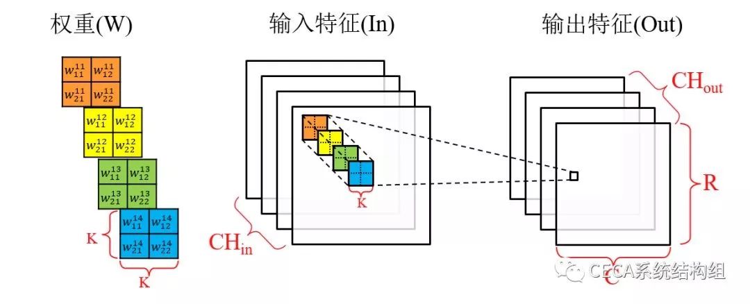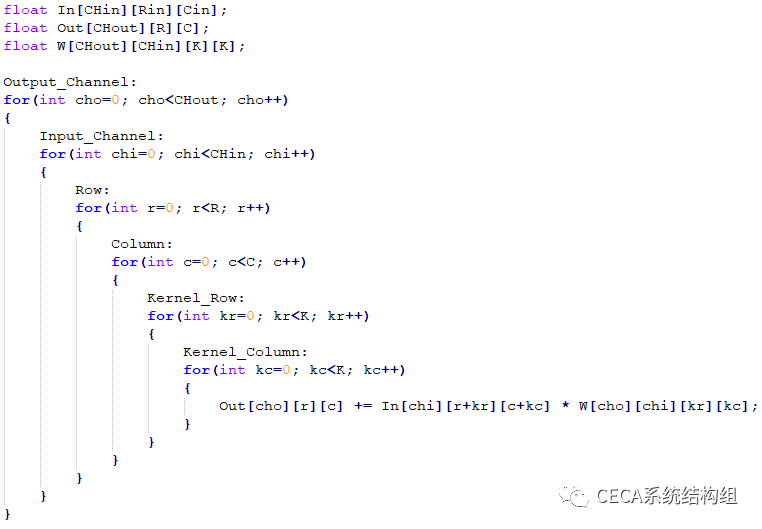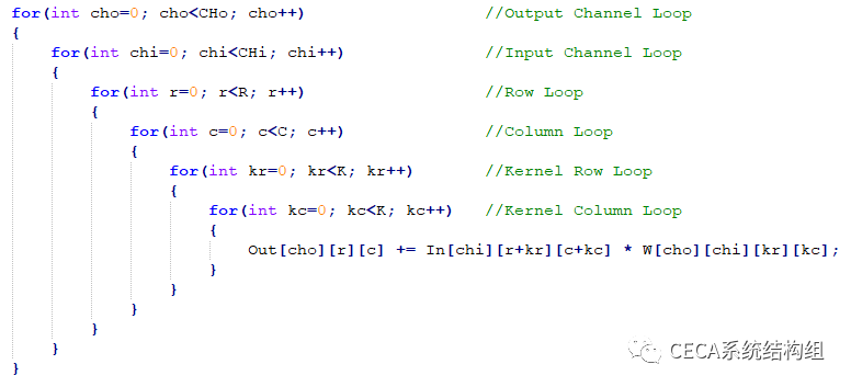整个卷积层的输入是 CHin 张输入特征图,输出是 CHout 张输出特征图,每张输出特征图的大小为 R×C。由于每一个「输入-输出」特征图对都有一个特定的卷积核用于卷积计算,所以总共有 CHout×CHin 个卷积核,每个卷积核的大小为 K×K。在进行卷积计算的过程中,每个卷积核滑过各自的输入特征图,并使用当前滑过的窗口中的输入特征与卷积核内的权重完成卷积计算 (对应位置相乘,所有乘积累加),卷积的结果会累加到对应位置的输出特征上。因此,卷积计算的算法流程如下式所示: