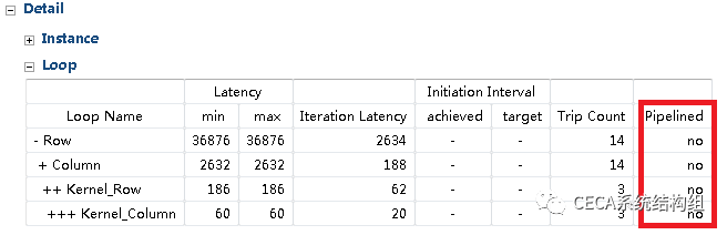 在 HLS 工具中重新综合,我们可以发现延迟降到了 36876 个时钟周期 (具体数字可能略有差异),有了 6.82 倍的加速效果。但当我们仔细看 HLS 的综合报告时可以发现,虽然我们实现了一个并行加速器,可是这个加速器调用并没有流水化起来:
