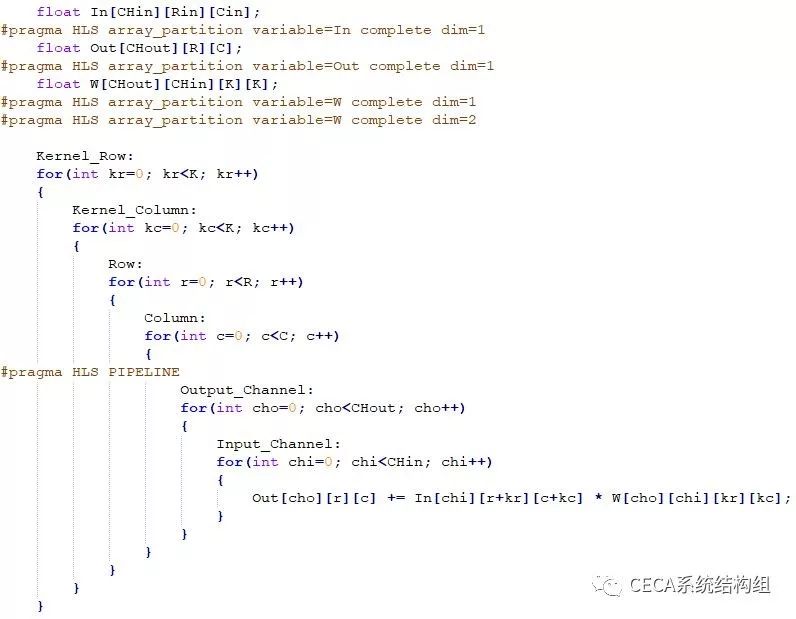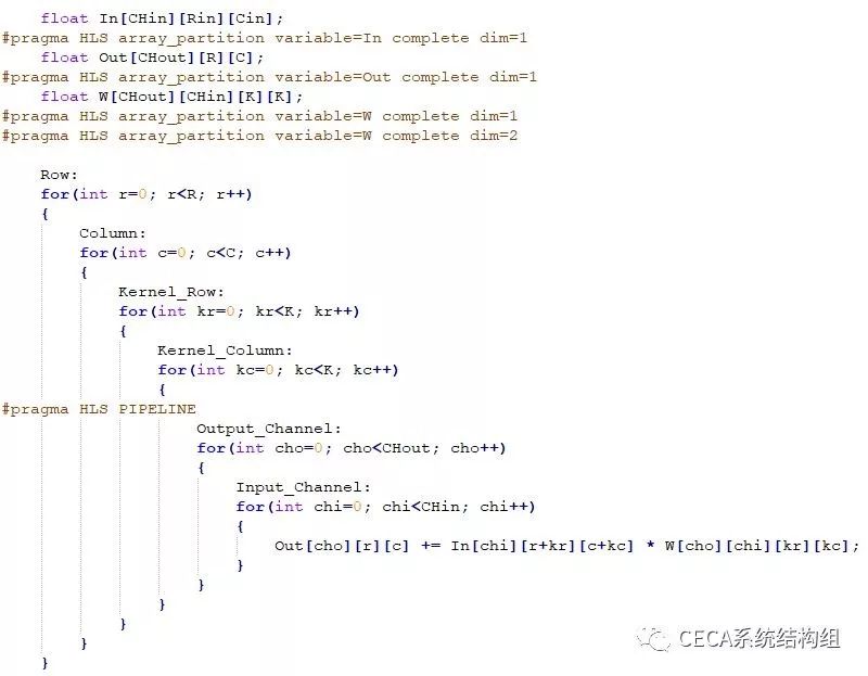 本质上来说,卷积层前向计算的流程就是一个嵌套的 6 重循环,而在循环的最内层进行的是乘累加运算。在我们的示例中,我们用如下代码放入 HLS 工具中进行综合分析: