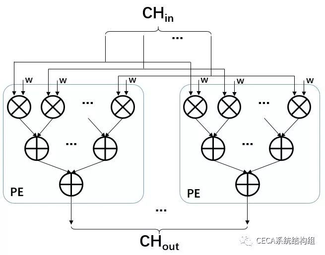 我们使用 CHin 个并行的乘法器来并行处理不同通道的输入特征与其对应权重的乘法,这些并行乘法的乘积累加到一起,即为一个输出通道的的卷积结果,这里,我们把该模块称为一个处理单元 (Processing Element,简称 PE,即上图中蓝色框部分)。一个 PE 只负责一个输出通道的卷积计算,我们可以把 PE 复制多份,形成上图的结构,来并行处理所有输出通道的卷积计算。总结来说,这个加速器调用一次可以并行处理包含 CHin 个输入特征点和 CHout 个输出特征点的卷积计算,而其中所有输入特征点都属于不同的输入通道,输出特征点也分属于不同的输出通道。要完成整个卷积层 6 重循环的计算,我们需要重复多次调用这个加速器。