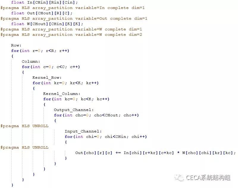 循环展开:为了描述出我们的加速器在输入通道和输出通道两个维度进行了并行优化,我们需要使用 pragma UNROLL 来将这两个循环完全展开,pragma UNROLL 的具体语法请参考 Xilinx 官方文档。