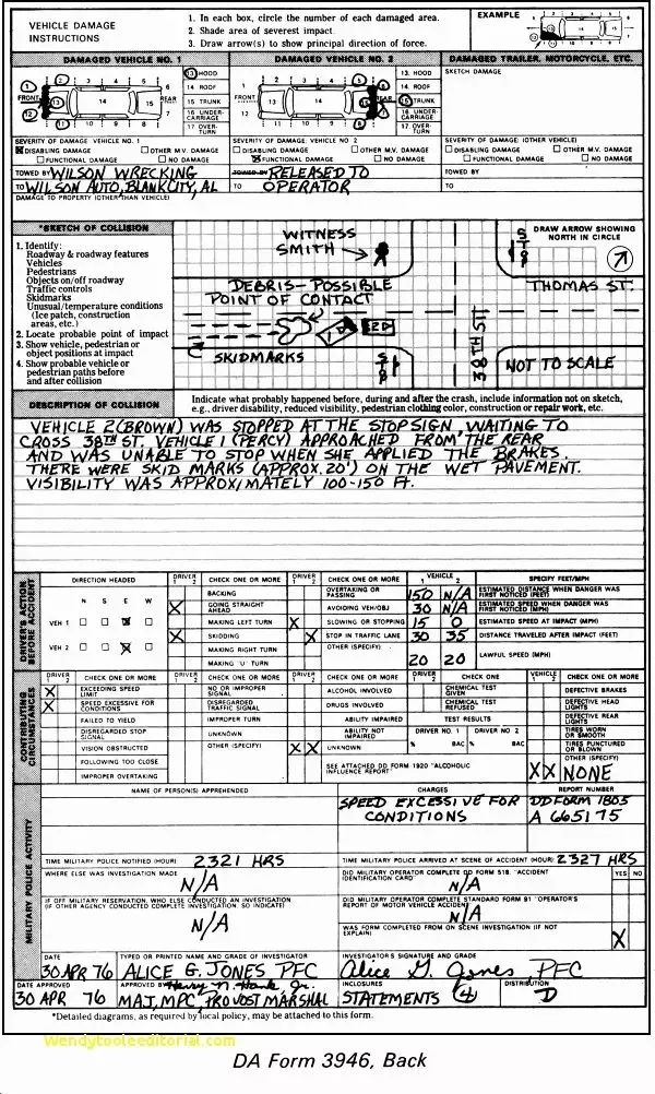 交通调查需要的事故数据一般包括事故发生日期、时间、地点、天气、地面干湿或是否有冰雪,以及车辆数、车辆行驶方向、碰撞角度和形式等。如果事故涉及行人或自行车,还需要知道行人或自行车所在位置、行走方向及与机动车的碰撞形式等。图9是美国警察常用的事故记录单,要写清楚碰撞部位、怎么碰撞的、事故发生地点,如街道名称等,还要描述事故车辆当时的行驶路径、车辆注册情况等。美国不同州警察会用不同的记录模式,但大致内容相同。